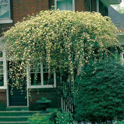 Lady Banks has endless possibilities for use in the landscape. It's ability to climb and spread is great for the trellis, walls, fences, and where ever it can get a hold. It is easily shaped with minimal pruning.
