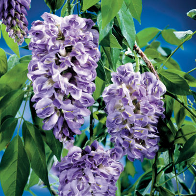 The 'Amethyst Falls' flowers sooner than the Asian types (some of which can take 10 years or more), blooming its first season with fragrant, vividly blue flowers on 4- to 6-inch racemes that appear in spring and repeat all summer. Its bloom also arrive about two weeks later than others, so late-winter frosts seldom affect flowering.